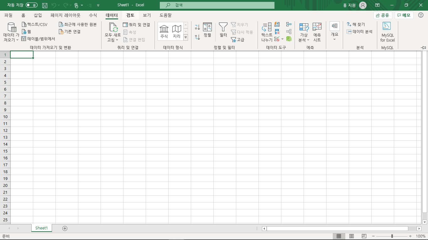 - mysql for excel을 설치하면 아래 사진의 '데이터' 탭의 맨 오른쪽에