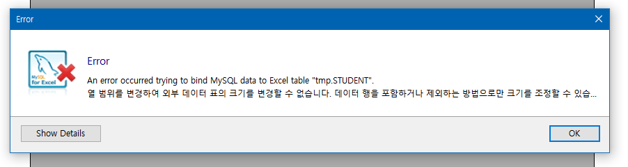 'An error occurred trying to bind MySQL data to Excel table '[테이블 명]'