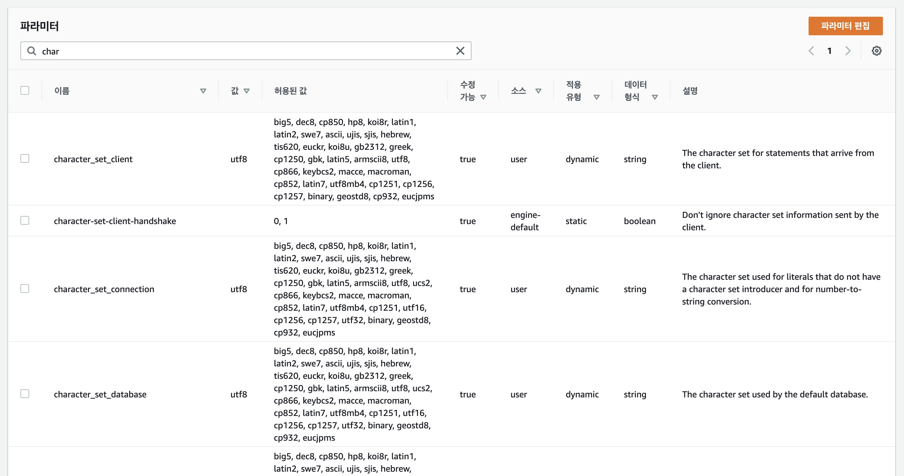 RDS의 파라미터 그룹에서 해당하는 파라미터의